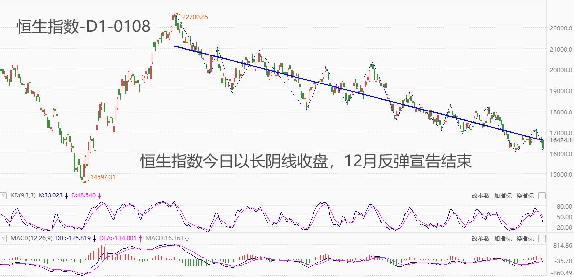 ATFX港股:K线形态当中的长阴线有两重含义,其一是代表行情剧烈下跌,卖出力量远大于买入力量;其二是代表市场参与者情绪极为悲观,持有筹码的信心不足。今日,恒生指数大跌超2%,K线形态呈现出长阴线结构,宣告12月11号以来的反弹波段终结,可能不久之后恒生指数将刷新月内新低点。2024年总计运行了五个交易日,其中有四个交易日都以阴线收盘,唯一收阳线的交易日还在开盘出现了跳空下跌。五个交易日累计跌幅4.95%,股票市场的持有信心极度萎靡。那么,什么原因导致了这种情况的出现?恒生指数的跌势还将持续多长时间?以下是我们的看法: