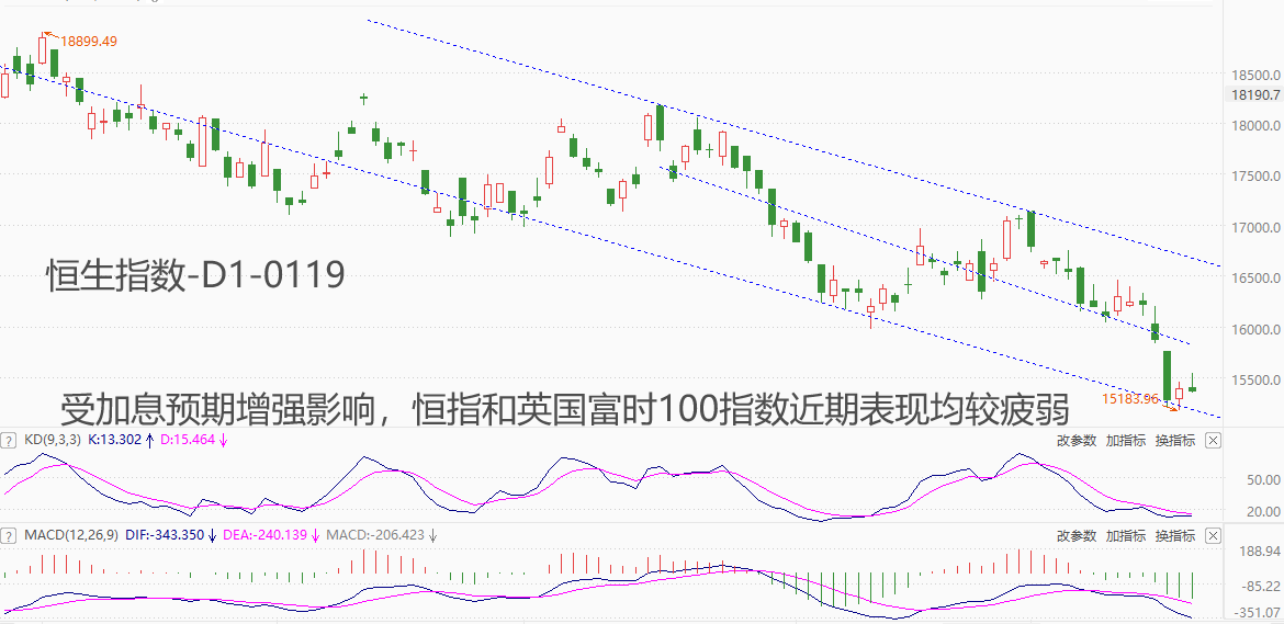 技术角度看,恒生指数处于中期空头趋势之中,近两周有加速下跌的迹象。市价已经触及下降通道线下轨,有可能获得支撑,今日K线形态较为关键。震荡指标KD的读数处于20超卖线下方,一旦快慢线向上交叉,则后市看反弹。MACD指标的柱线处于零轴之下,且绝对值不断放大,意味着中期空头趋势仍在延续。综合来看,多数指标认为恒生指数的中期空头将会延续,但由于短期内超跌,下周有望出现暂时性的反弹走势。