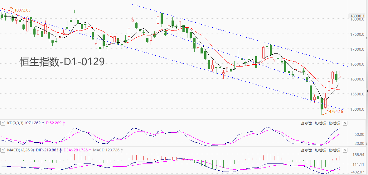 技术角度看,恒生指数处于中长期空头趋势之中,23日至今的反弹波段已经接近通道上轨,后市有遇阻回落的可能。震荡指标KD的读数逼近80超买线,但快慢线尚未向下交叉,短期仍有上涨可能。MACD指标的柱线已经向上翻越零轴,柱线不断放大,中短期趋势存在由空转多的迹象,但这一判断需要更长时间的红色柱线来验证。综合来看,多数指标认为恒生指数的反弹将遇阻,个别指标认为涨势还将延续。