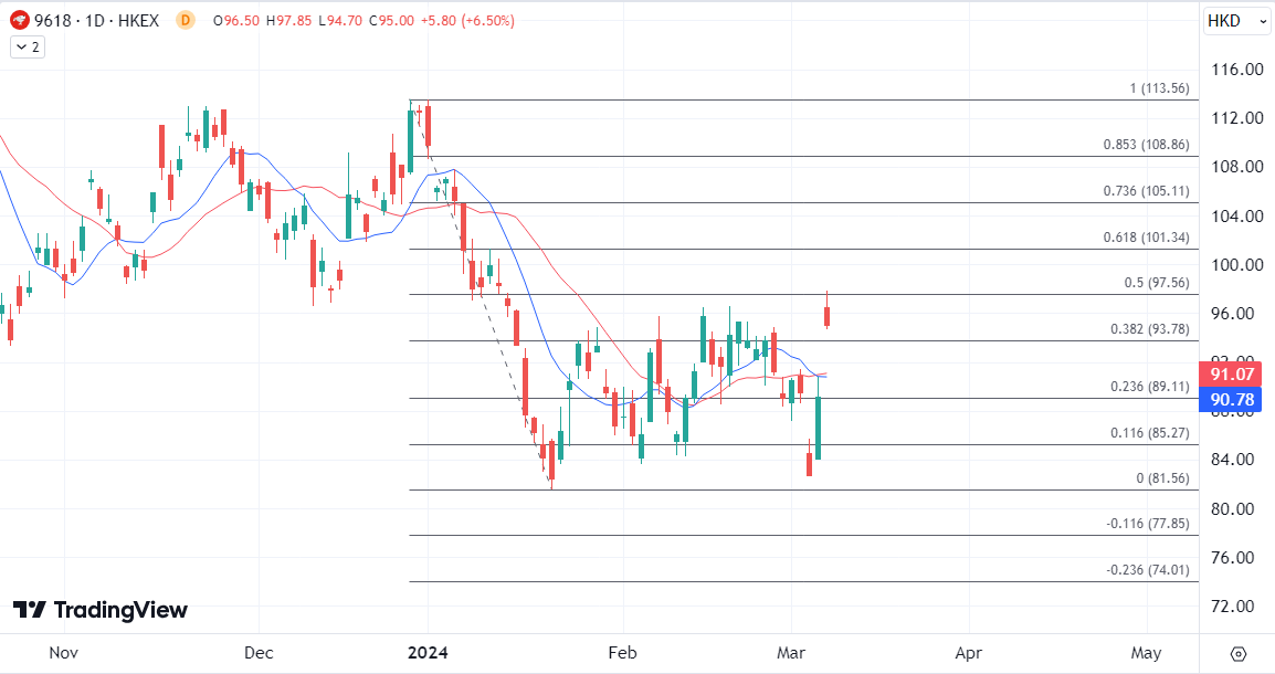 昨日绩前京东(09618)已股价经大幅收高逾7%,今早继续大幅高开到达1月24日以来的最高位,突破了超过一个月的交投区间顶部,当前留意以97至100港元为阻力范围,但如果100整数关口未能逾越,则会重新回到区间内交投。