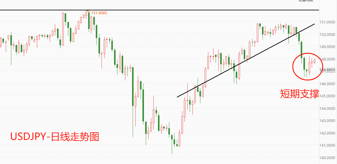 上图为USDJPY的日线走势图。技术角度看,USDJPY处于中长期上涨趋势之中,但涨势并不顺畅,经常出现幅度极大的回调波段。最新一轮回调波段已经出现短期支撑的特征,市价距离黑色回归线也已经有一段距离,后市止跌回升的可能性较高。历史大顶出现在151.90关口,如果本轮反弹能够有效突破该阻力,则未来上涨空间将彻底打开。需要提醒的是,历史高点被突破,往往伴随着经济面的深刻变化。如果未来数周日本央行和日本经济没有超预期的变动,USDJPY向上冲击150整数关口可能再次以失败告终。