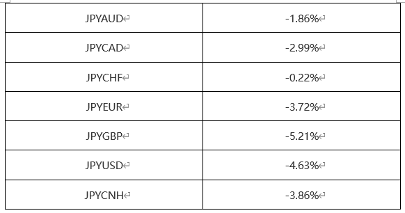 上表为100日元相对其他货币的涨跌幅,周期为年初至今。七个货币对,数值均为负,意味着日元在年初至今的这段时间里呈显出普遍的贬值特征,这与前文所述的“日本尚未摆脱通缩”和“日本央行推迟加息时点”的判断有重要关联。具体数值来看,JPYGBP的跌幅达到5.21%,位居所有货币对首位,英镑成为日元贬值的最大受益者。贬值幅度最小的是JPYCHF,主要是因为瑞士的宏观经济相对稳定,没有出现如美国一般的高通胀问题,所以在过去两年没有出现激进加息,瑞郎的升值预期没有其它货币那么强烈。