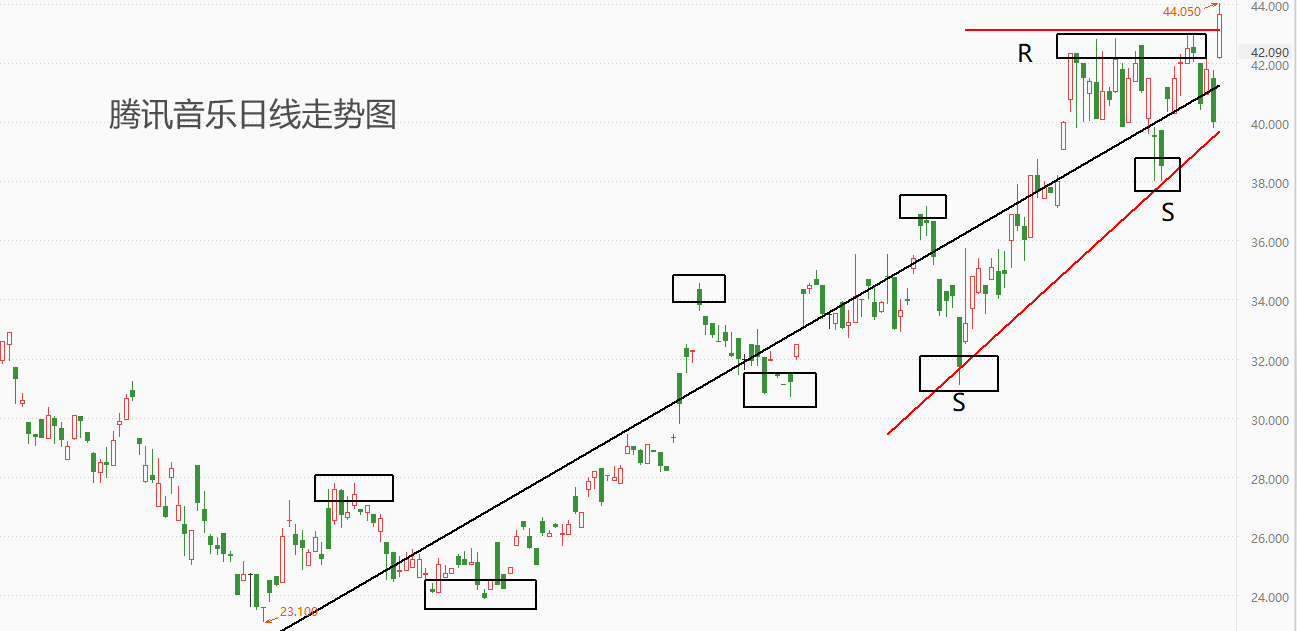 上图为腾讯音乐日线级别走势图。技术角度看,腾讯音乐的股价正处于上涨波段,最近20根K线出现横盘震荡特征。昨日财报披露后,腾讯音乐股价大幅跳涨,一举突破短期阻力位43港元关口,如果今日收盘没有重新进入震荡区间,则有效突破的概率大增,后市上涨可能性较高。从黑色回归线的角度看,腾讯音乐的股价已经达到一个标准差的距离,后市可能出现向下的回归行情。下方支撑位38港元,一旦该支撑被跌破,则顶部结构形成,后市发展不容乐观。