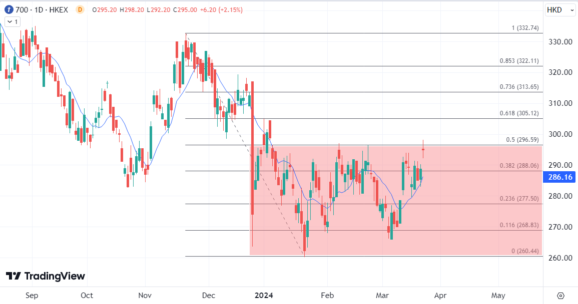 ATFX港股:3月20日,腾讯控股(00700)公布第四季度财报。净利润从上年同期的1,062.7亿元降至人民币270.25亿元;净利润不及FactSet对分析师的调查预期的人民币340.5亿元,归因于2022年第四季度确认视同处置美团的收益人民币1,066亿元。