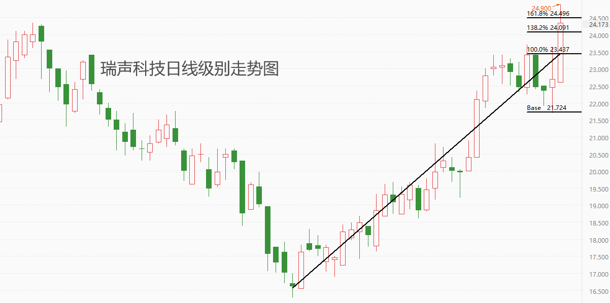 上图为瑞声科技日线级别走势图。技术角度看,瑞声科技的股价处于快速上涨阶段,最近的起涨点在21.724港元,同时该价位也是短期支撑位。受到2023年业绩数据的提振,瑞声科技的股价大涨7.27%(截至上午盘),表明股票市场对本期的业绩数据极为满意。今日最高达达到24.9港元,距离“回归理论”所提示的强阻力位25.2港元较近,近期涨势可能遇阻。大盘角度看,恒生指数在经历昨日的跳涨之后,今日突然跳空下跌,截至上午盘累计跌幅达到3.04%,股市情绪面较为悲观,瑞声科技的上涨行情将受到一定程度的拖累。