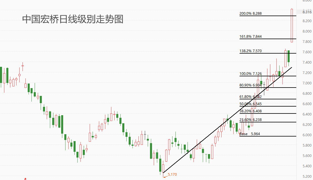 上图为中国宏桥日线级别走势图。技术角度看,股价这个处于快速上涨波段,上周年报发布后,今日股价大幅拉升,进入加速上涨阶段。不过,市价已经远离黑色回归线,一旦后市出现有效阴线或者顶分形结构,遇阻回落概率较高。黄金分割角度看,市价已经触及200%分位,达到理论上涨目标,短期获利盘可能扎堆出逃,最终导致回调走势出现。