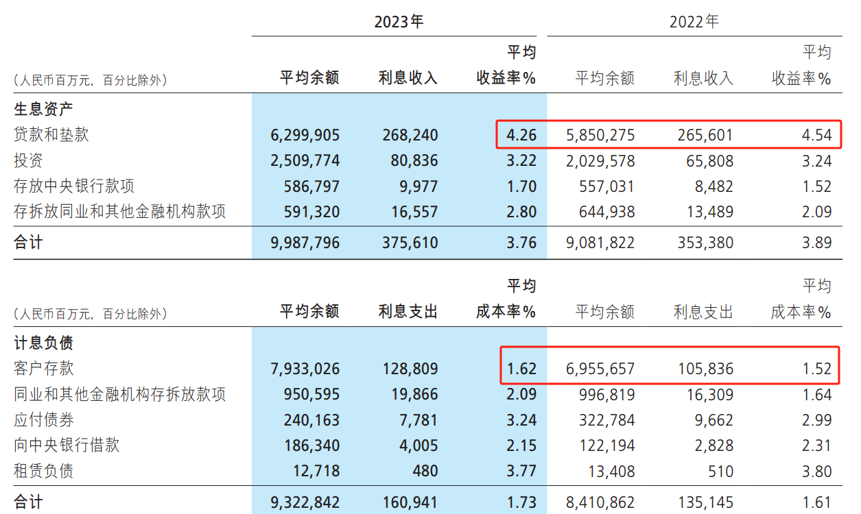 净利息收入来看,2023年,主要生息资产——贷款和垫款的收益率为4.26%,相比2022年的4.54%下降了28基点。2023年,人民银行将一年期LPR利率从3.65%下调至3.45%,降幅与招商银行的生息资产收益率降幅相同。然而,在生息资产收益率下降的同时,计息负债的成本率却没有同步下调,这是导致净息差和净利率收益率下降的主要原因。2023年计息负债的成本率为1.62%,相比2022年的1.52%升高了10基点。之所以成本率没有随着短期LPR利率下调,原因或许与市场竞争和客户端对收益率有刚性需求有关。