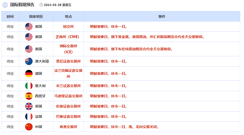 本周五是耶稣受难日,欧美股票市场将休市一日,港股市场也将休市一日,芝商所CME旗下的黄金白银等贵金属,美元指数、欧元等货币以及能源类合约都将暂停交易。周五休市会导致本周非开市时段由两天(周六末)延长为三天,休市市场越长,期间发生不可预料事件的可能性越高,下周一的开盘越有可能出现跳空或者跳涨。对于保守型的交易者来说,在周五休市之前降低仓位可以有效规避隔周的跳空风险。
