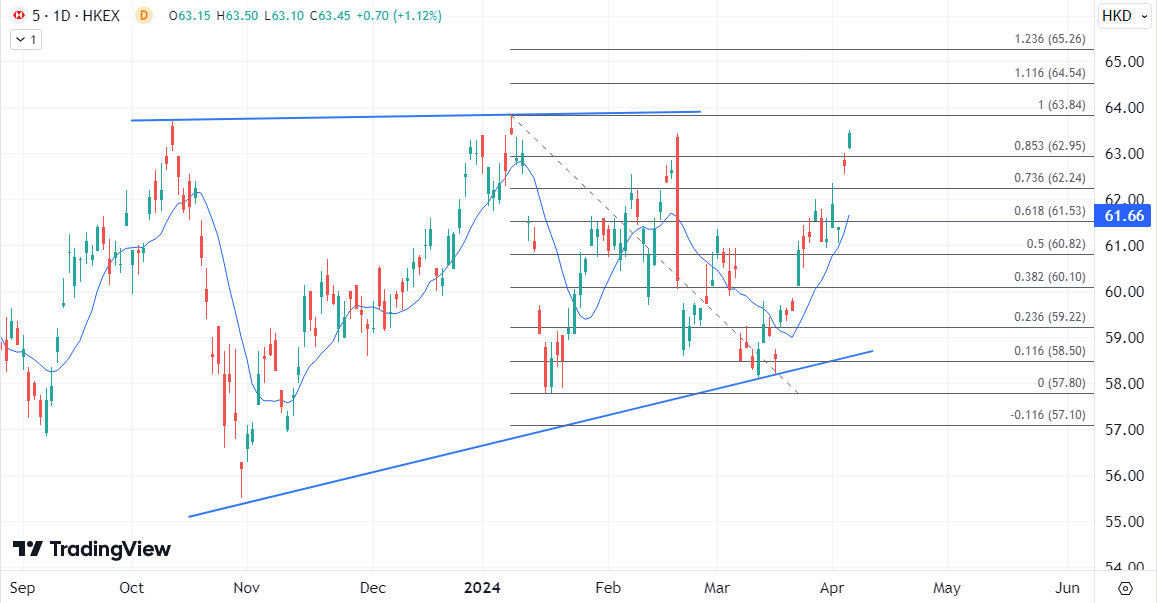 今日汇丰控股延续上行录得七个月高位,因此目标指向1月份高位在63.84港元,看会否延续在64港元下方的遇阻而带来回落压力重回62港元下方,但如果寻得突破则会打开更高空间指向65.26港元为目标。