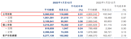 存款方面,公司存款总额5.06万亿元,相比2022年的4.8万亿显著提高;个人存在从2.67万亿元增长至3.22万亿,同比涨幅约20.6%。平均成本率角度看,公司存款的成本率从2.13%升高至2.31%,个人存款的成本率从2.29%升高至2.37%,综合成本率从2.19%升高至2.33%。成本率的提升与定期存款平均余额快速增长有关。