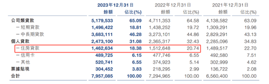 贷款质量方面,公司类贷款总额5.18万亿元,占贷款总额的65.09%,相比2022年比重提高0.51个百分点。个人贷款总额2.47万亿元,占贷款总额比重31.08%,相比2022年下降1.35个百分点。主要是收到个人住房贷款从1.51万亿下降至1.46万亿的影响,降幅约3.3%,对个人贷款的余额表现形成冲击。