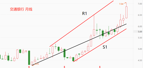 上图为交通银行长周期股价走势图。2021年8月份之间,交通银行进入持续上涨通道,相比银行板块内其它个股,涨幅长期位于第一梯队。本月,交通银行月线更是走出长阳线形态,涨幅8.36%,大于工行的2.46%、建行的3.64%和农行的5.67%,表现亮眼。技术角度看,市价仍未触及R1上轨阻力,后市仍有进一步上行空间。