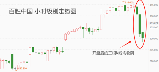 财报发布后,百胜中国的小时级别K线持续下跌,截至上午盘结束,三根K线均收阴,表明股票市场将一季度财报解读为利空消息。此前,百胜中国的日线级别股价已经连续两日收阳,并且最近六个交易日当中只有一根小阴线出现,其余均为阳线。今日的长阳线回吐了此前四个交易日的涨幅,短期内空头趋势恐将延续。