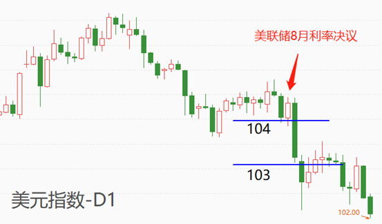 本周四2:00,美联储将公布8月货币政策会议纪要,市场人士将从中看到美联储官员在货币政策会议期间的主要观点。由于美联储主席鲍威尔在8月利率决议后的新闻发布会上讲话称:“数据符合要求的情况下最快9月降息”,态度极为鸽派,所以美元指数在隔天暴跌1.06%,第三天继续大跌,市价连续突破104和103两个关键整数支撑位。8月会议纪要有可能再次放大鲍威尔和美联储其它官员的鸽派观点,利空美元指数的概率较高。