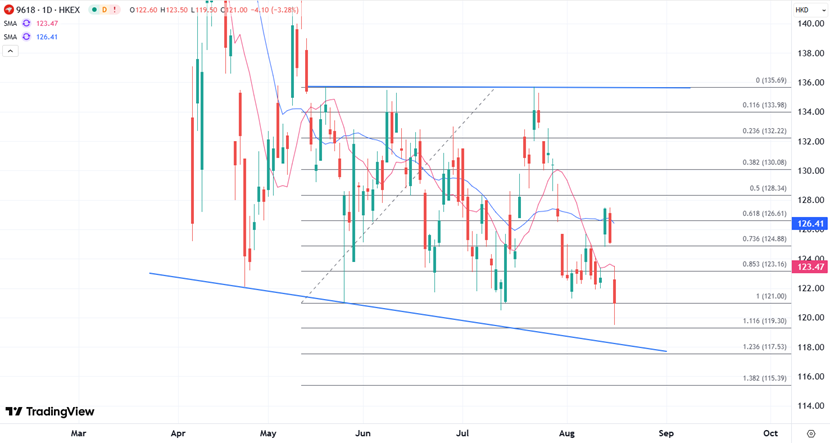 京东股价在绩后直接低开低走,除了最新业绩拖累外,部分跟随大市的下行压力,股价一度创下去年9月以来的最低,技术上10日均线成了盘中高位,留意120港元下方成为目标,如果跌破意味着更多的卖盘可能跟进,但留意低位趋势线可以提供部分支撑。