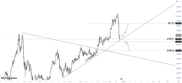 从技术结构看,黄金整体仍运行在清晰的中期上升趋势中。图表显示,金价自 11 月以来沿着上升趋势线稳步抬升,前期下行趋势线已被有效突破并转化为中期结构支撑,确认趋势由整理转为单边上行。近期金价在快速拉升后出现剧烈回调,但回落并未破坏上升趋势线,显示抛压更多来自高位获利了结,而非趋势性反转。目前市场正围绕关键支撑区间反复博弈。