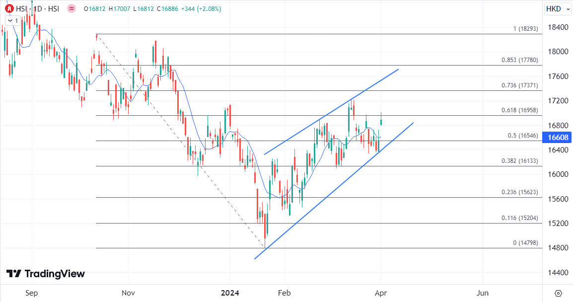 ATFX港股:长假后港股开局强劲,恒指半日大涨近400点 ATFX港股:港股复活节长假期后4月首个交易日造好,恒指高开270点后升幅扩大至逾400点一度冲上万七点关口。恒指半日升390点或2.4%,报16931。国指升152点或2.6%,报5962。科指升82点或2.4%,报3559。 科技股方面,科技指数午后最新涨近1.8%,小米集团(01810)首款智能