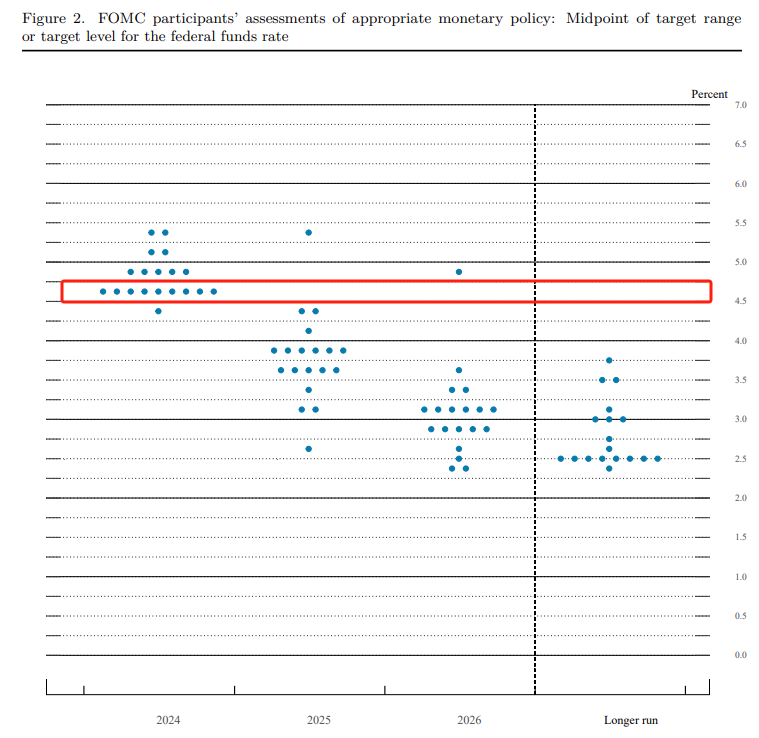 ATFX汇市:鲍威尔重申年内降息,隔夜行情上演“美指跌到,全球吃饱” ATFX汇市:今日2:00,美联储公布最新一期利率决议结果,维持5.25%~5.5%的基准利率不变,QT速度保持不变。点阵图显示,多数委员对2024年底的利率预期依然维持在4.5~4.75%(去年12月份的点阵图同样显示该区间),但对2025和2026年的政策利率中位数预期