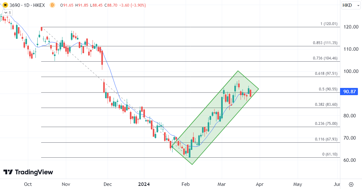 ATFX港股:美团股价绩前回落,待业绩冲击100港元关口 ATFX港股:美团(03690.HK)将于今日公布业绩,昨日股价盘中最高涨逾5%,市场预计上一季度其收入可能维持稳健的增长。 投资者将关注美团管理层提供最新管理层指引,包括外卖业务利润率(透过“拼好饭”等业务拓展低客单价用户)、对骑手补贴成本、到店业务的竞争、以及