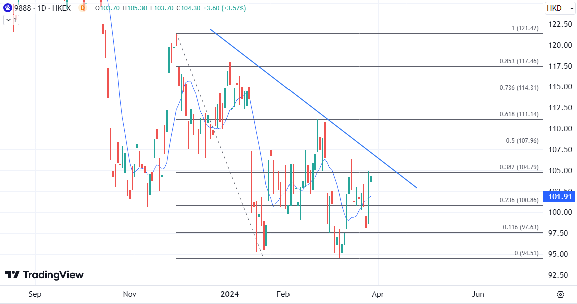 ATFX港股:传为苹果提供AI功能,百度股价连续两日拉升 ATFX港股:传周一百度港股股价(09888)一度涨超6%,有消息称苹果将在中国产品中采用百度AI服务。尽管百度和苹果官方仍没有回应,但百度美国存托股上周五曾因此消息一度上升4%,成交大增1.4倍。 苹果一直在探索利用外部合作伙伴,来协助加速人工智能雄心。据上周来自