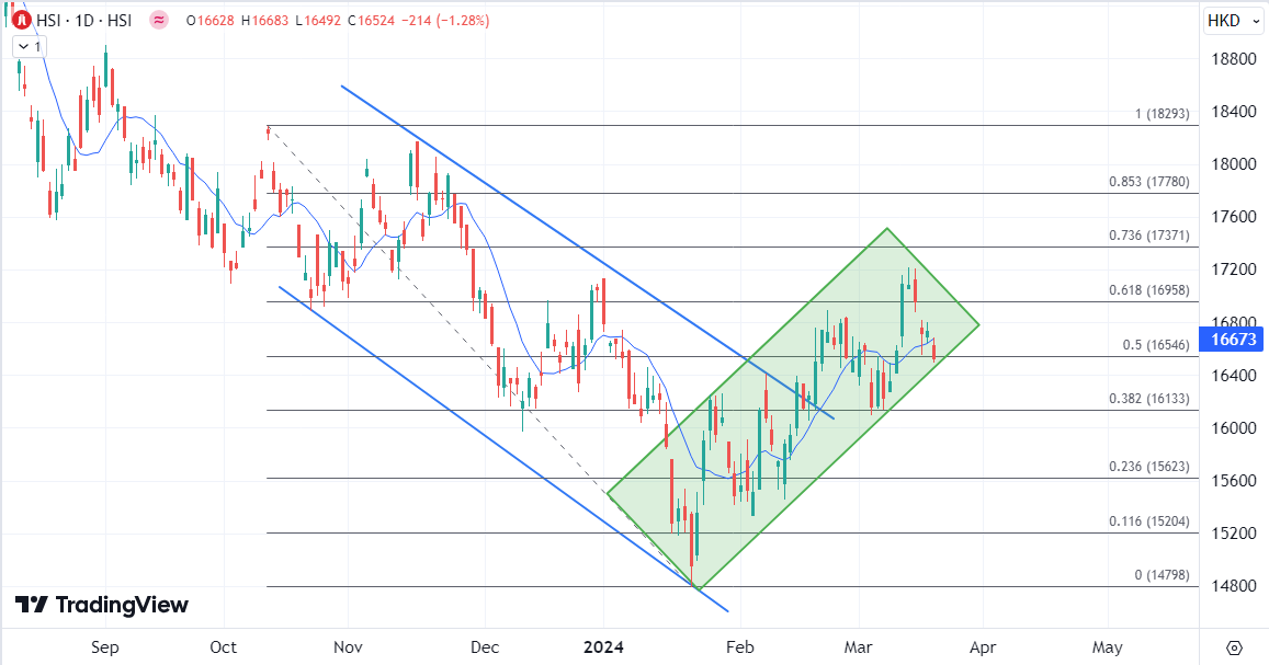 ATFX港股:港股疲惫失守主要均线,恐再次威胁16000关口 ATFX港股:港股早市低开109点,半日收跌186点或1.1%,报16550点。国指跌60点或1%,报5787,失守100天线。科指跌63点或1.8%,报3530,大市半日成交497.02亿港元。 多数科技股表现弱势,据报盒马CO侯毅将退休,阿里(09988)梳理线下零售业务,股价低开1%后维持跌势