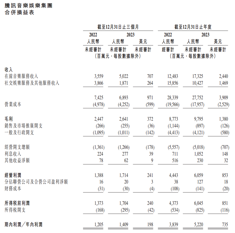 ATFX:腾讯音乐发布年报,营收微降净利大增,股价创上市以来新高 ATFX港股:3月19日,腾讯音乐娱乐集团发布2023年第四季度及全年财报,其中提到:2023年全年,总收入为人民币277.5亿元(39.1亿美元),同比下降2.1%;净利润为人民币52.2亿元(7.35亿美元),同比增长36.0%;2023年在线音乐付费用户数四个季度净增总计1,8