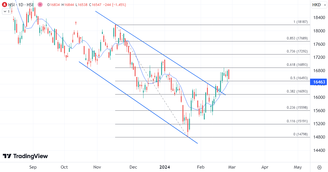 ATFX港股:财政预算公布后动力不足,恒指或向16000关口调整 ATFX港股:港股今日期指结算,恒指昨日收弹156点返百天线后,今早小幅高开。《財政預算案》公布后,恒指午后一度止跌回升但很快回吐,当前走势较为反复。恒生指数半日跌44点,报16745点,成交570.6亿元。科指跌不足0.1%,报3501点。 科技股方面,网易(09999