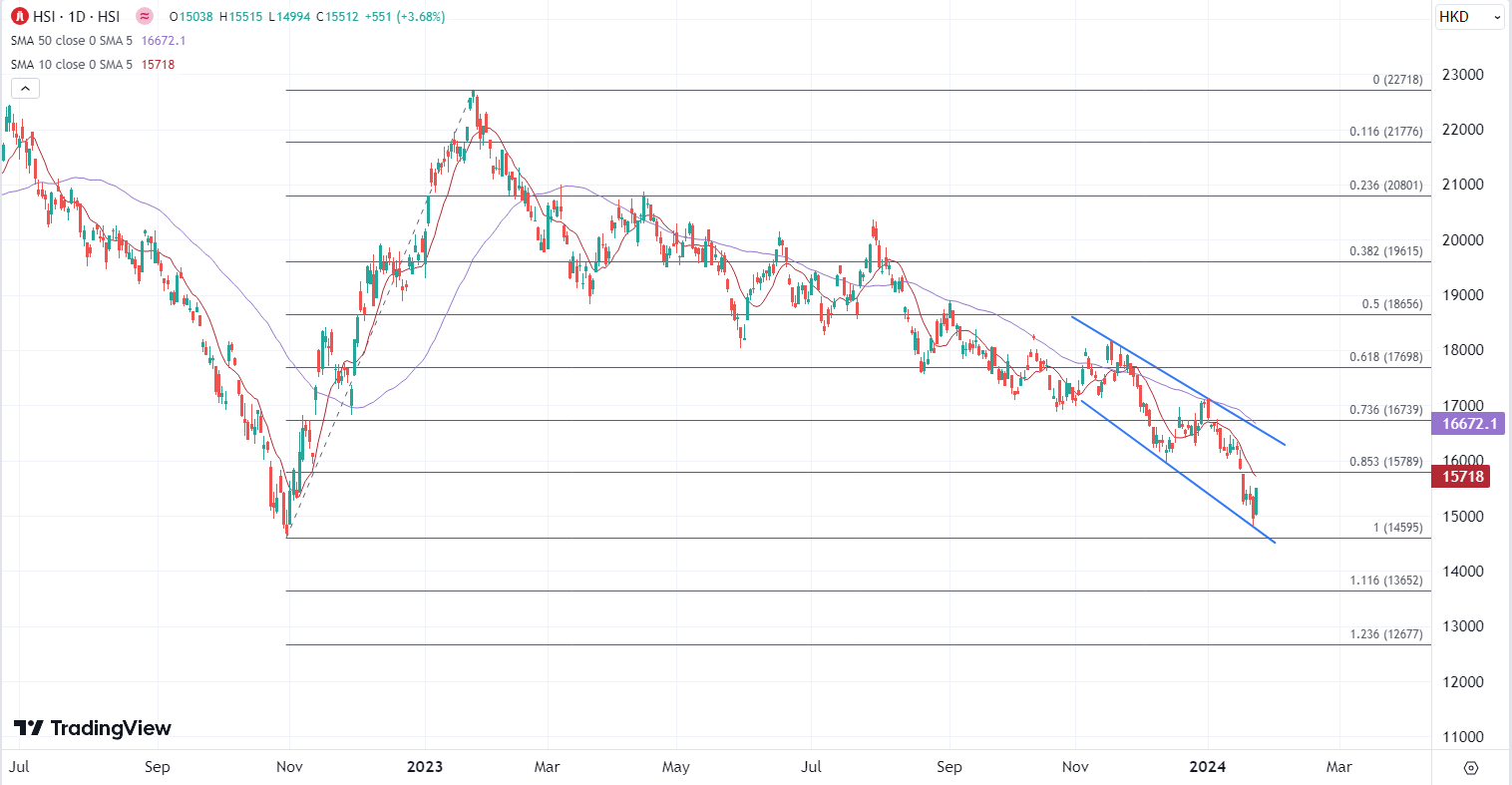 ATFX港股:传一系列救股市措施,恒指连跌后直线拉升 ATFX港股:港股两日挫430点失万五关,创15个月低位后今早出现急涨,据外媒报道,政府考虑推出一系列救股市措施,消息刺激恒指一度急升511点,科指一度急升5.2%。最终恒指半日升368点或2.5%,报15329;国指收报5137,升2.7%;科指飙3.6%,收3143。 报道指,政府考虑设