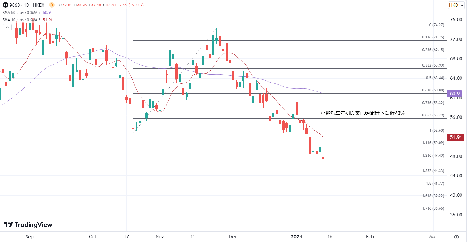 ATFX港股:特斯拉开启新年第一降,汽车股日内重返下跌 ATFX港股:今年初以来,汽车股整体出师欠佳,在昨日尝试短暂回升后,日内多数汽车股再度调整,小鹏汽车(9868)领跌,幅度超过4%。今年以来的9个交易日,有7个都处于下跌。 ▲ATFX图 昨日港股汽车股普涨,理想汽车(02015)、比亚迪(1211)涨幅在2.79%至3.04%之间,