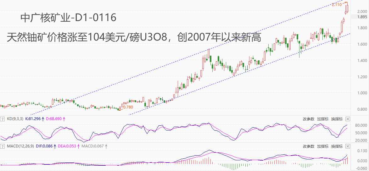 ATFX港股:中广核矿业六连阳,市价不断刷新上市以来新高 ATFX港股:今年以来,隶属于核电板块的中广核矿业,累计涨幅已超20%,最近六个交易日的累计涨幅逼近30%,市价屡创上市以来新高。为什么中广核矿业的股价开年以来表现如此靓丽?我们认为有以下几点原因: 铀矿价格创历史新高。中广核矿业是东亚唯一的纯铀业上市公