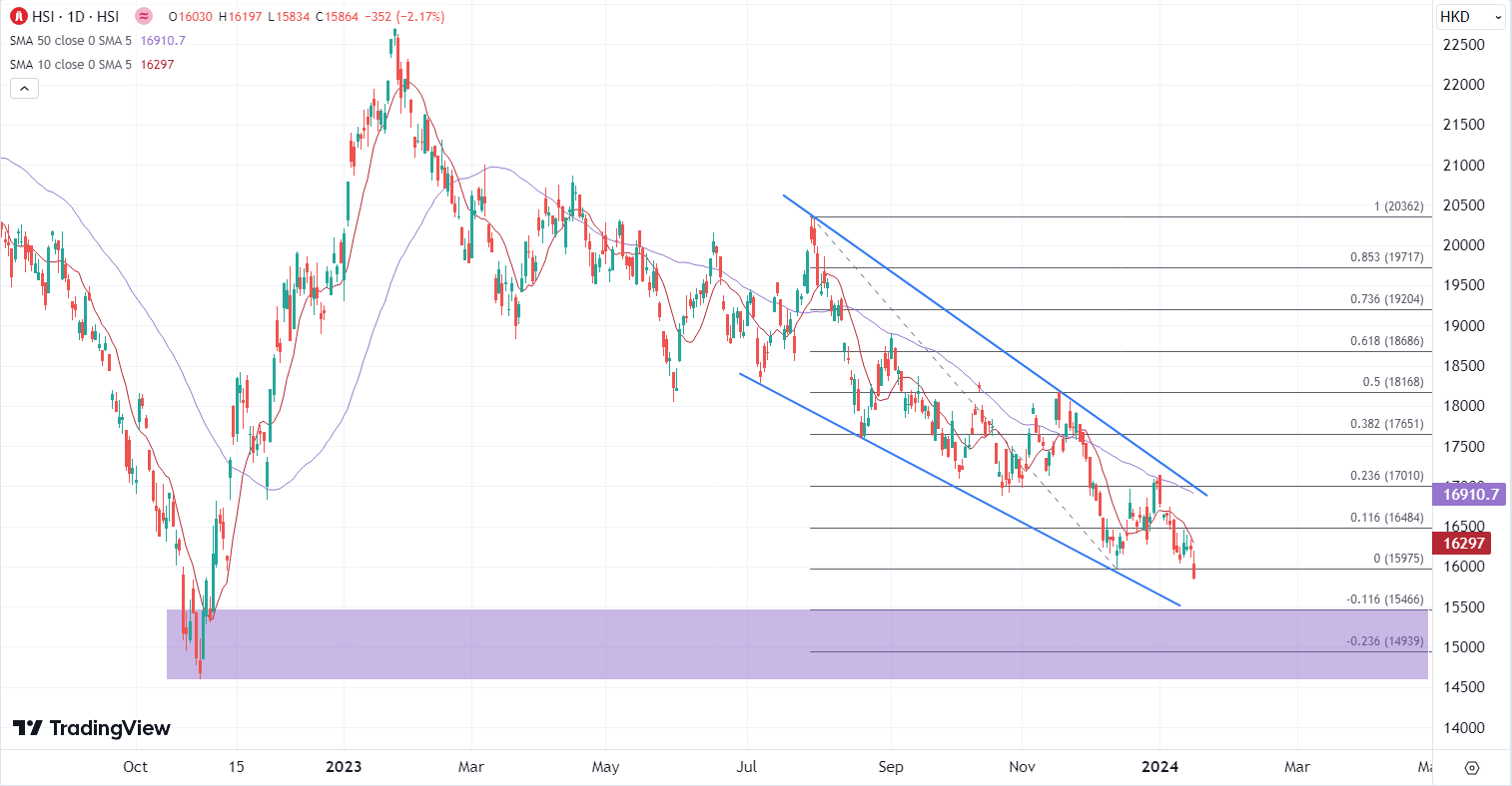 ATFX港股:多个板块齐挫,恒指急跌创逾14个月低位 ATFX港股:港股连跌两日后,今早低开逾1%,恒指低开186点创五周最低位,午后跌穿上午低位一度跌逾350点失守16000关口,再刷新自2022年11月上旬以来的最低位,内地上证指数午后也创逾三年半低。 蓝筹股几乎全面向下,京东健康(06618)沽压最大,股价挫逾7%创上市新低。