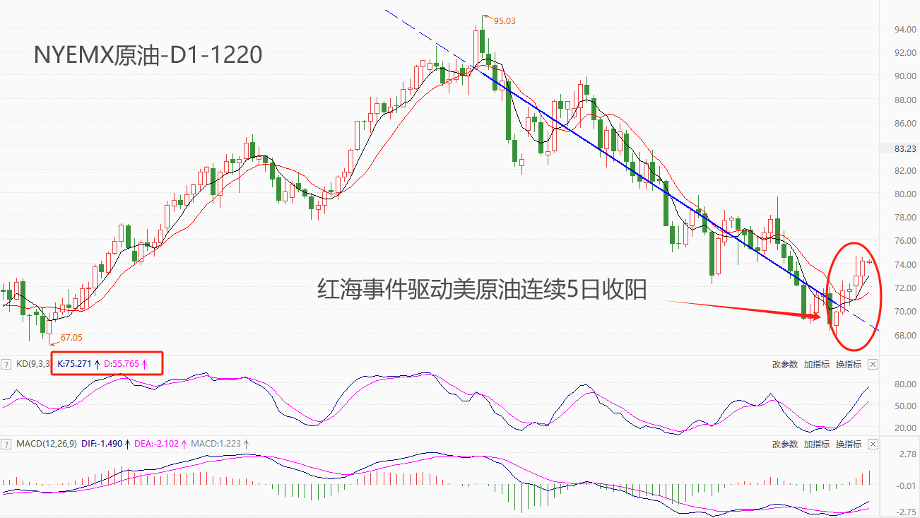 ATFX期市:受红海事件影响,美原油连涨五日,75美元关口待突破 ATFX期市:本周一,也门胡塞集团发表声明称:禁止红海上的商船前往以色列港口。美国相关部门表态称,将采取多国行动保护红海贸易。该事件是巴以问题的衍生事件,由于红海地处国际航运要道,且距离中东产油国较近,所以引发市场人士对于原油供应端的担忧。12
