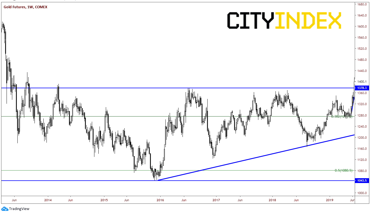 此后,金价2015年回撤了50%涨幅,2013年到2019年6月,金价一直处于$1050至$1400之间一条相对稳定的横盘通道。