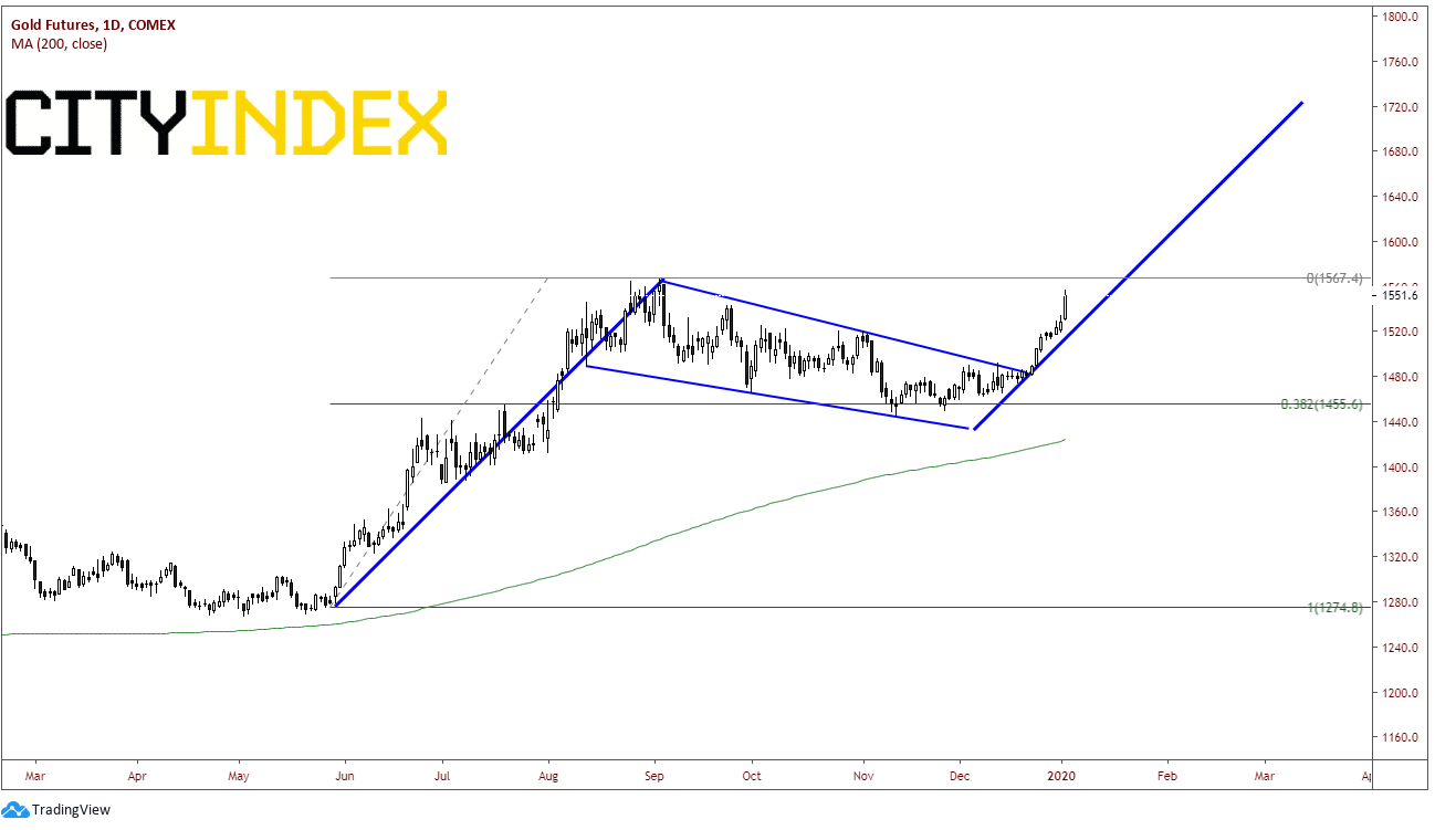 不管美国和伊朗之间局势发展,金价已连续两周走高。一些人可能将此归因于年底因素或股市超买状态。无论原因是哪个,黄金已突破美丽的三角旗形,似乎正在朝着目标挺进!