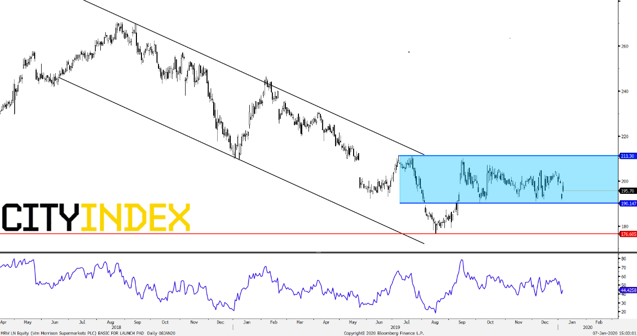 整个行业的颓势令运营商层面的微弱光芒微不可见,这其中包括Morrisons的22周同店销售数字。该数字下降1.7%,分析师的预测为下滑2.2%。在英国运营着500家左右超市的Morrisons表示,由于消费者不确定性和过去一年一样没有变化,交易环境依然“具有挑战性”。这样的表述给保守党上月以绝对优势赢得大选后涌现的绝对“Boris反弹 <https://www.cityindex.co.uk/market-analysis/boris-bounce-seen-for-tesco-sainsbury-morrisons/>”期待蒙上一层阴影。保守党胜出将帮助清除脱欧僵局对消费者信心的打击,但脱欧的延宕给经济造成的深层次冲击将挥之不去。
