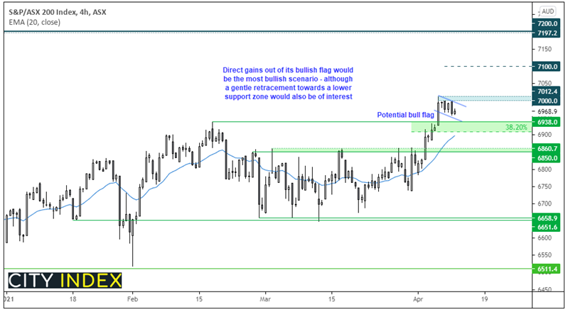 ASX200指数正在7000下方构筑潜在看涨旗形形态。扩大走势前先行休整利于交易员增加潜在风报比,实际上可能是件好事情(如果有效)。交易员可以在盘整时找到更明确的入场价位(如果价格成功突破),或者出场价位(如果价格反转)。