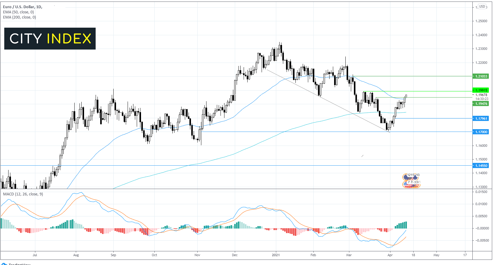 下档当前支撑位可见于50期指数移动均线1.1935,如果下破该位,当前上涨趋势或落空,并为跌至200期指数移动均线大关1.1840打开空间。(来源:嘉盛集团)