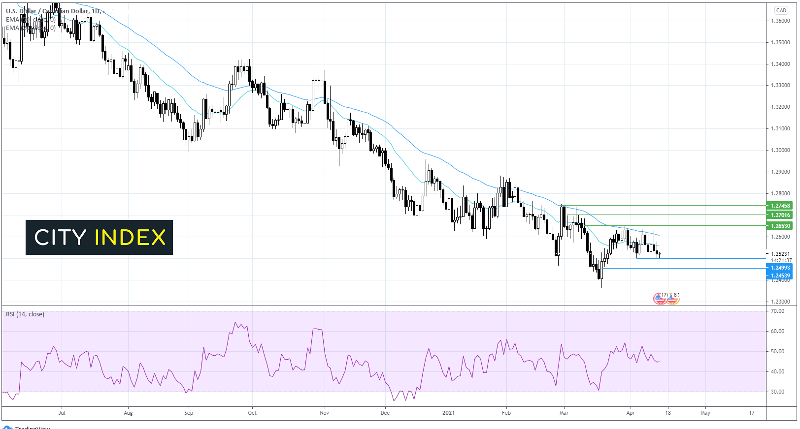 美元/加元交投于下降趋势线、20天和50天指数移动均线下方,表明当前趋势为下跌。