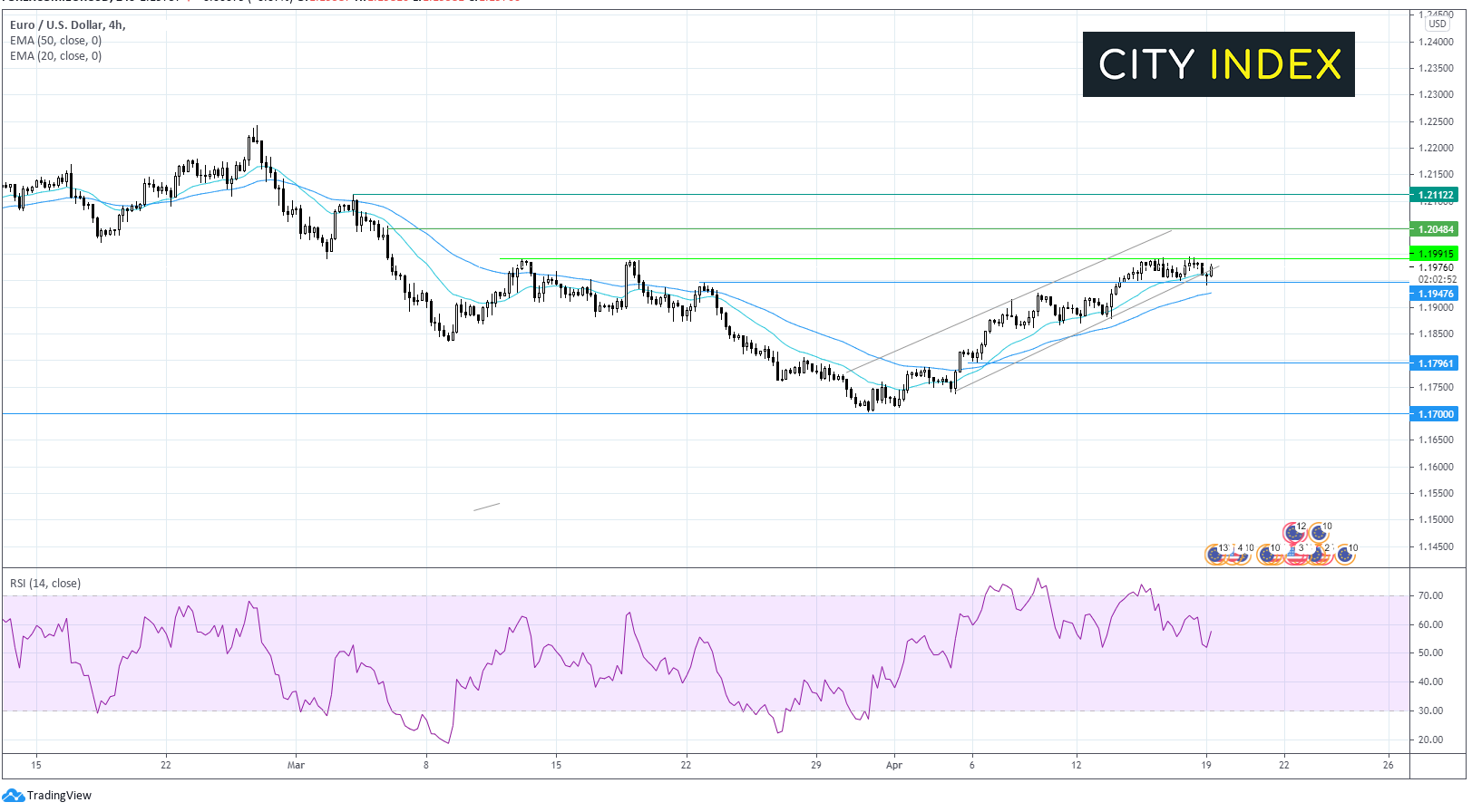 1.20为多头需要拿下的关键水平,然后是3月4日高点一线水平阻力1.2050和3月高点1.2110。