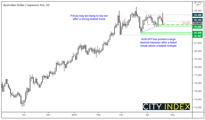 澳元/日元假突破对称三角形后于隔夜大力调头向下并形成一根大型看跌锤子K线,放大视野后我们发现这是2月底以来第三根大型看跌反转K线,表明后市可能构筑一个更大的触顶形态(即使可能并不是教科书般的形态,也并不令人愉悦)。