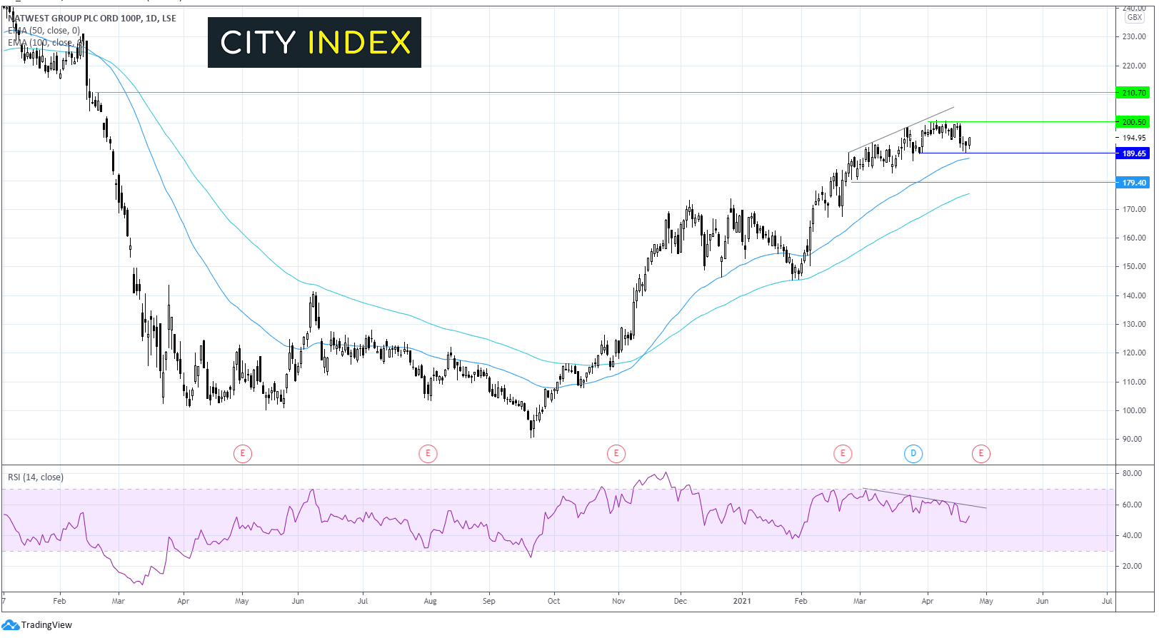 在之前触及大流行低点90便士后,股价一直交投上扬,在160-170便士区间整固后于本月继续上行攻向大流行后高点200便士。RSI看跌背离暗示涨势丧失动能并在走弱,可能面临反转。若失守190区域水平支撑和50指数均线将引发更深回调,探向3月初支撑180便士。若上行,股价或升穿200阻力,然后上攻2020年2月中以来最高水平210便士。