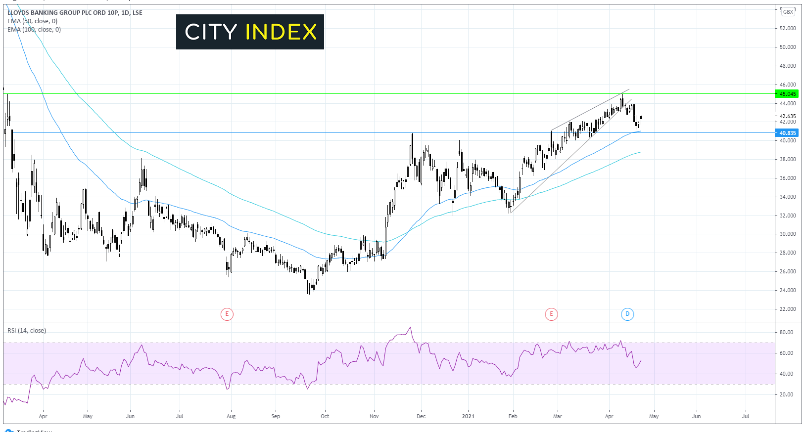 劳埃德股价在触及大流行后高点45便士后构筑一个上升楔形,接着转跌。反转走势于日线图50指数均线41便士位置获撑,这里也是11月25日高点。只有下穿该水平才能打消当前上涨趋势并探向100指数均线38便士。若财报意外强劲或指引意外乐观,股价或回看45便士并展开上破。