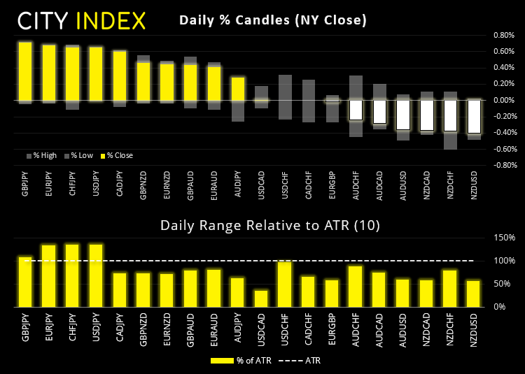 市场隔夜窄幅交投,主要股指都没有达到各自的10日平均真实区间(ATR)。Russell 2000摸至5周高点后回吐之前涨幅,时段收出一根犹豫K线形态。
