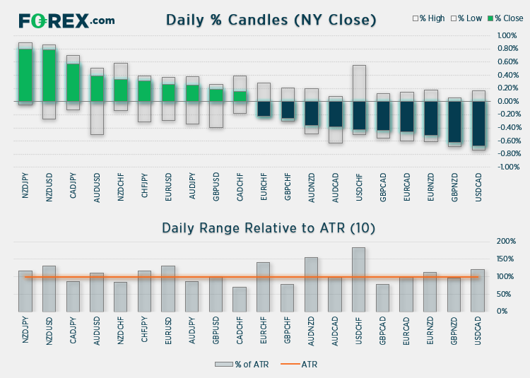 商品货币借美元势弱崛起,其中纽元/日元、纽元/美元和加元/日元领涨,而美元/加元、英镑/纽元被放逐。