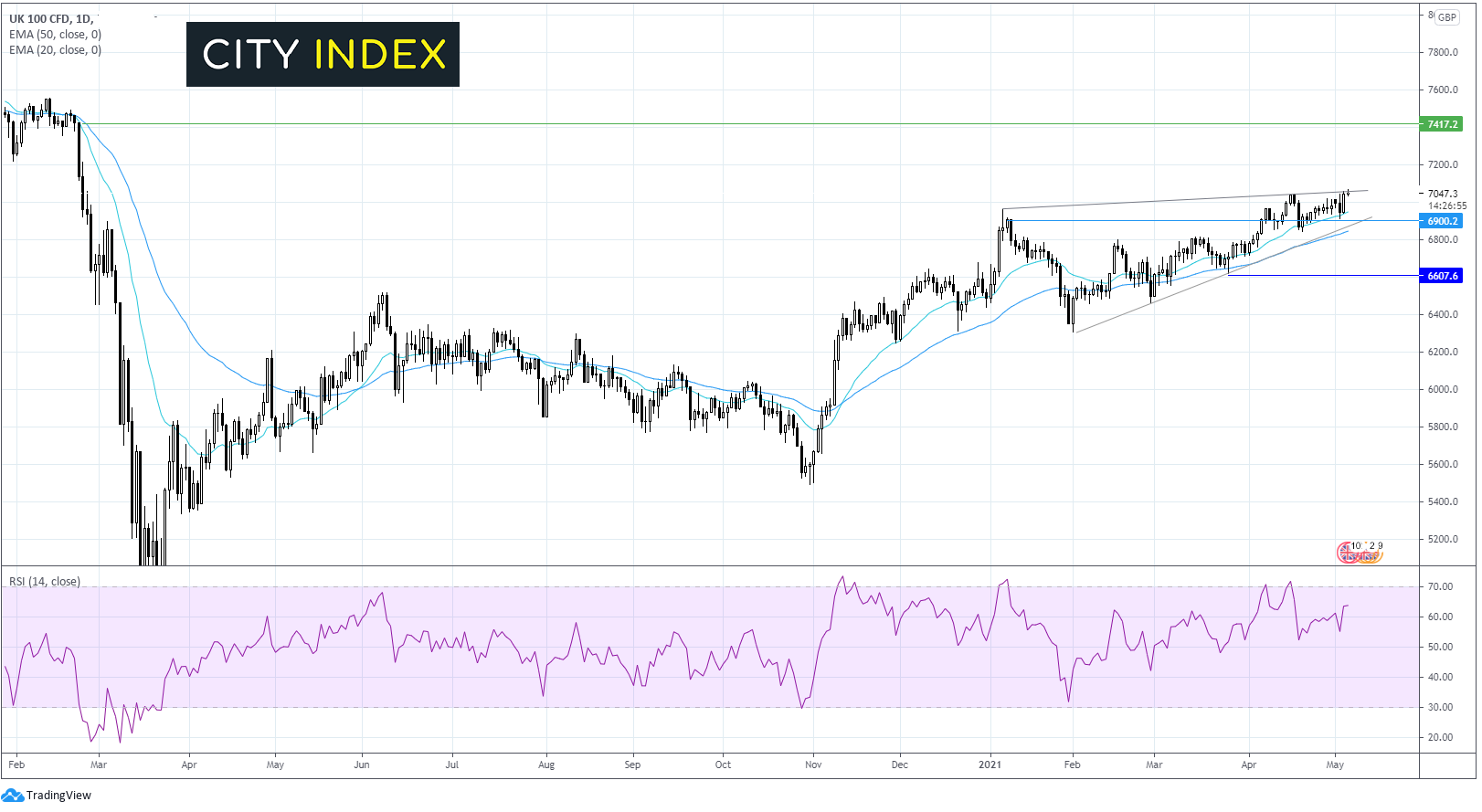 富时指数前一交易日上涨,创下疫前新高。日线图上,指数交投于20和50指数均线之上,并高于2月初以来上升趋势线