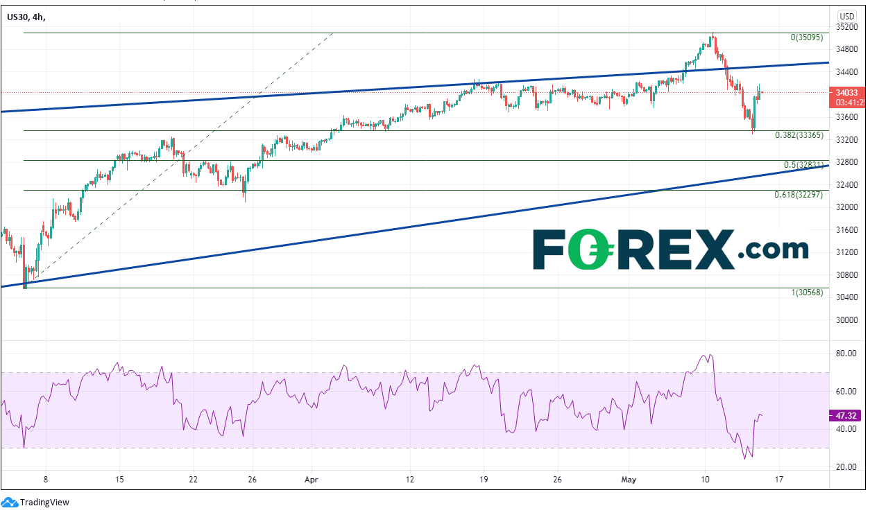 和其他许多股指一样,道琼斯工业股票平均指数(道指)自2020年3月跌至大流行低点以来持续上扬。美国主要股票市场均值一直在一个上升楔形中走高。道指在2020年秋季虚假下破底部趋势线。此后,股指重回区间内部并多次测试底部趋势线,然后推高并在4月中旬测试顶部趋势线。5月初,道指升穿顶部趋势线并形成流星线,RSI于超买区构筑背离。这是一个暗示道指可能准备回调的强烈信号。事实上,流星线带动价格重回楔形内部,价格正准备再度测试底部趋势线。