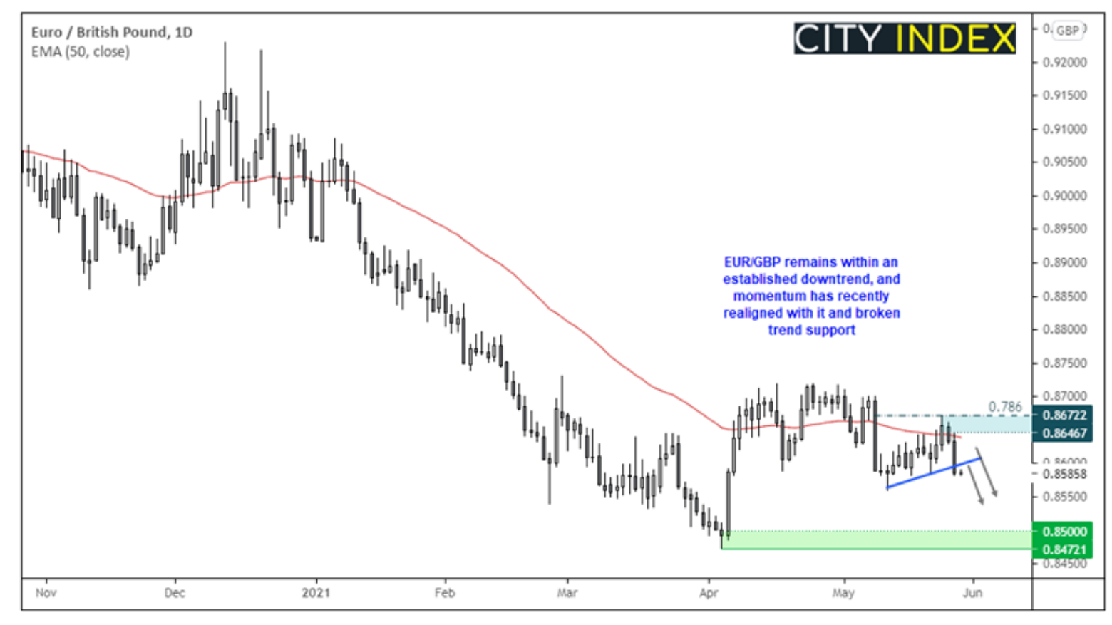欧元/英镑最近一直在给我们带来麻烦,几番曲折之后,我们认为终于看到了汇价5月10日自0.8700暴跌后希望确认的高点降低。汇价下跌后的修正于78.6%斐波那契水平遇阻。当天收于趋势线支撑之下,随着动能现在与主导跌势汇合,我们寻求汇价探回0.7472-0.8500低点。如果看跌趋势真的重建,我们认为价格不会重回昨日高点上方。