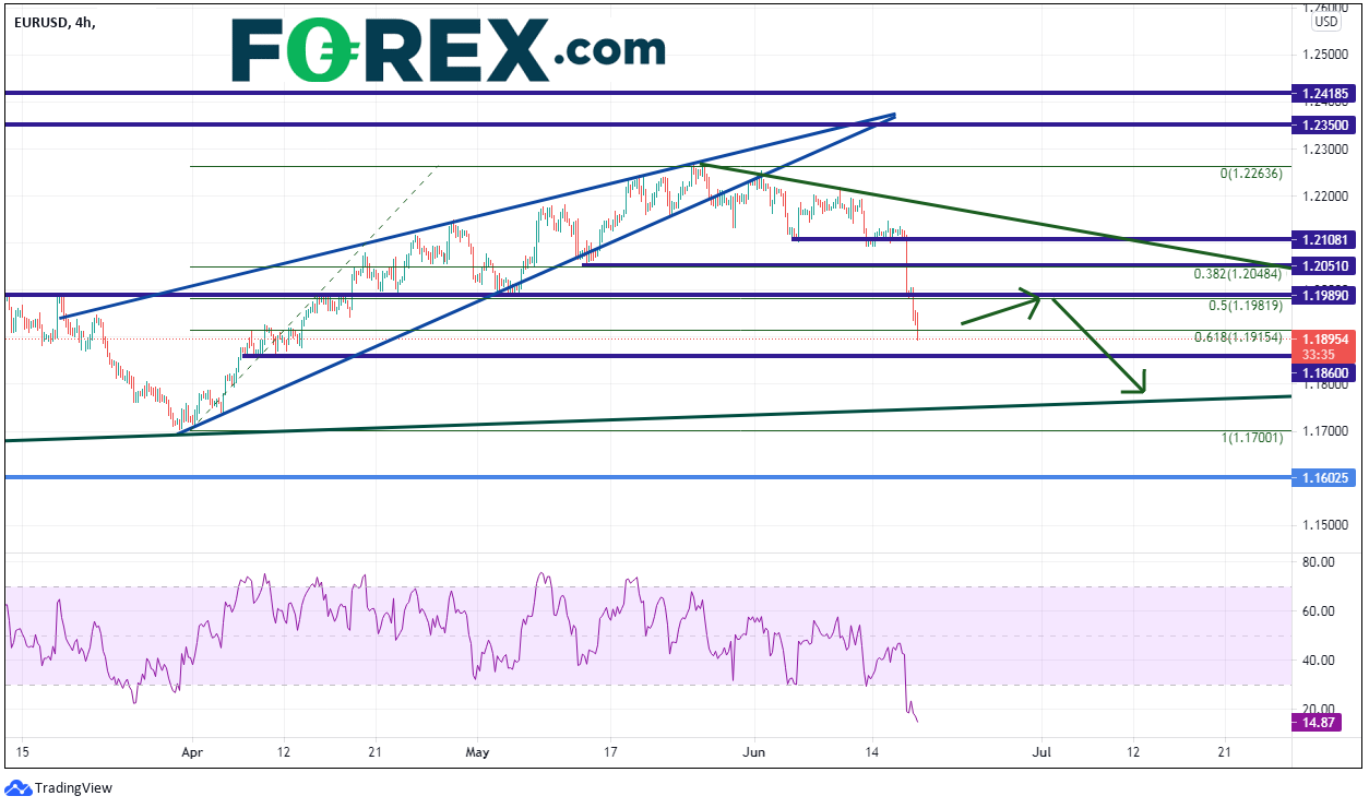 欧元/美元和美元指数走势类似,但走向截然相反,在FOMC声明发布之前,货币对交投于1.2100附近。此后,汇价大跌,探向3月31日低点跌至5月25日高点上行之50%回档1.1980附近。在240分钟时间轴上,货币对现已触及同期走势之61.8%斐波那契回档位,而RSI极端超卖。这表明该货币对可能做好了反弹准备,从而带动RSI回升。此情境下,卖盘可能会在1.1989附近及1.2050上方补充阻力位入场。欧元/美元处在一条较美元指数更长期的看跌楔形内部,目标位落在1.1700。但要达成目标,价格必须首先下破支撑1.1860和1.1745附近上斜趋势线。