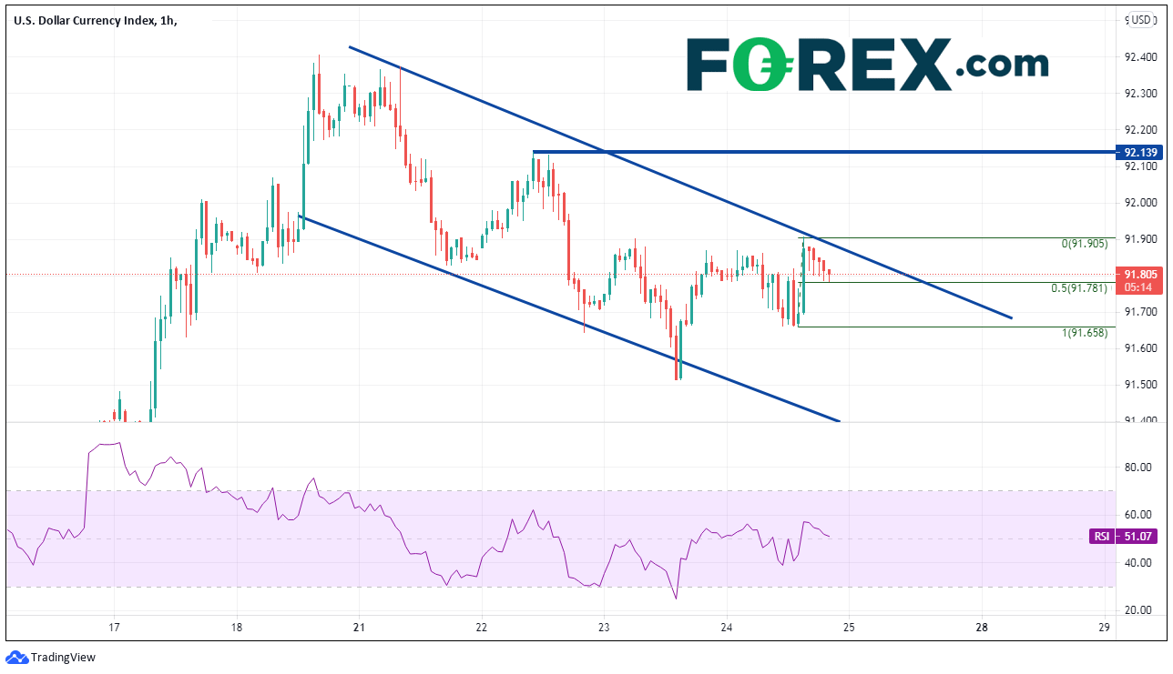 美元指数(DXY)自6月18日创下近期高点92.41以来持续回落。但在60分钟时间轴内,美元指数当天较早一直在推高。而更多支出也意味着系统中的美元增多,美元价值下降。因此,美元指数自趋势线阻力位回落至50%回档。进一步日内支撑位在91.66附近当日低点及6月23日低点91.51附近。阻力位在今天高点,也是上方下斜趋势线91.90附近,然后是6月22日高点92.12附近。