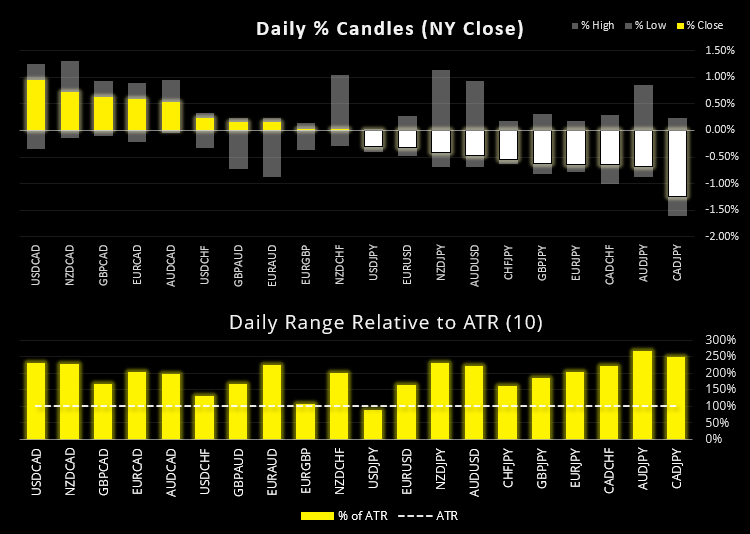 加元是最弱主要货币,受到油价和相关股票暴跌的拖累。日元是最强货币,吸引了避险资金流。美元紧随其后,是第二强货币。